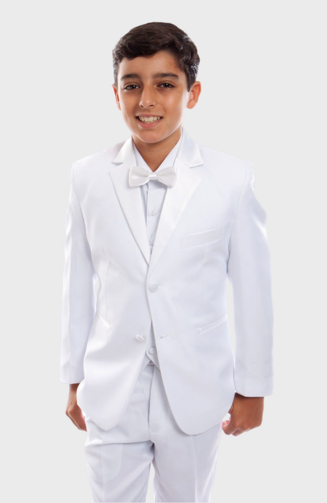 Take the guesswork out of formal dressing with this complete 5‑piece boys white tuxedo set — a ready‑to‑wear outfit that looks sharp from head to toe.