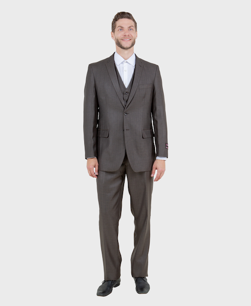 This Brown color three-piece sharkskin suit is perfect for formal events. The two-button single-breasted jacket features a slim notched lapel, this suit features a textured weave that appears as a smart plain from a distance but shows a unique crosshatch effect at close quarters. In addition, the suit offers unrivaled comfort despite its modern fit design, and it’s expertly designed to keep you dry on a hot day.