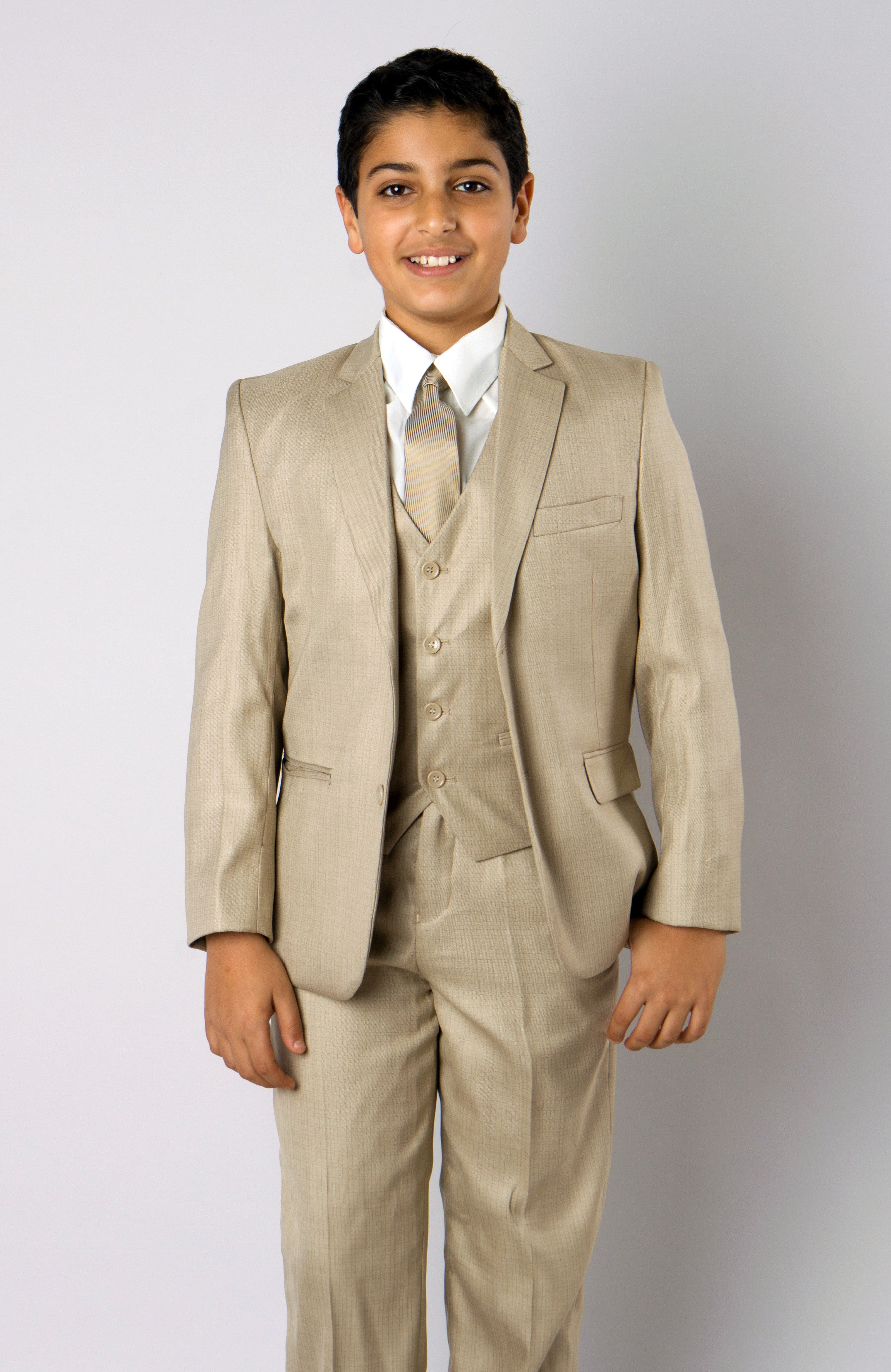 Dress up your little man quickly with this five piece beige boys suit. It comes complete with matching vest, shirt, and tie, eliminating the need to shop for the complimentary pieces. The traditional formal cut of the suit ensures that your child looks his best for any occasion. The pants can be hemmed to the proper length for a true formal appearance.