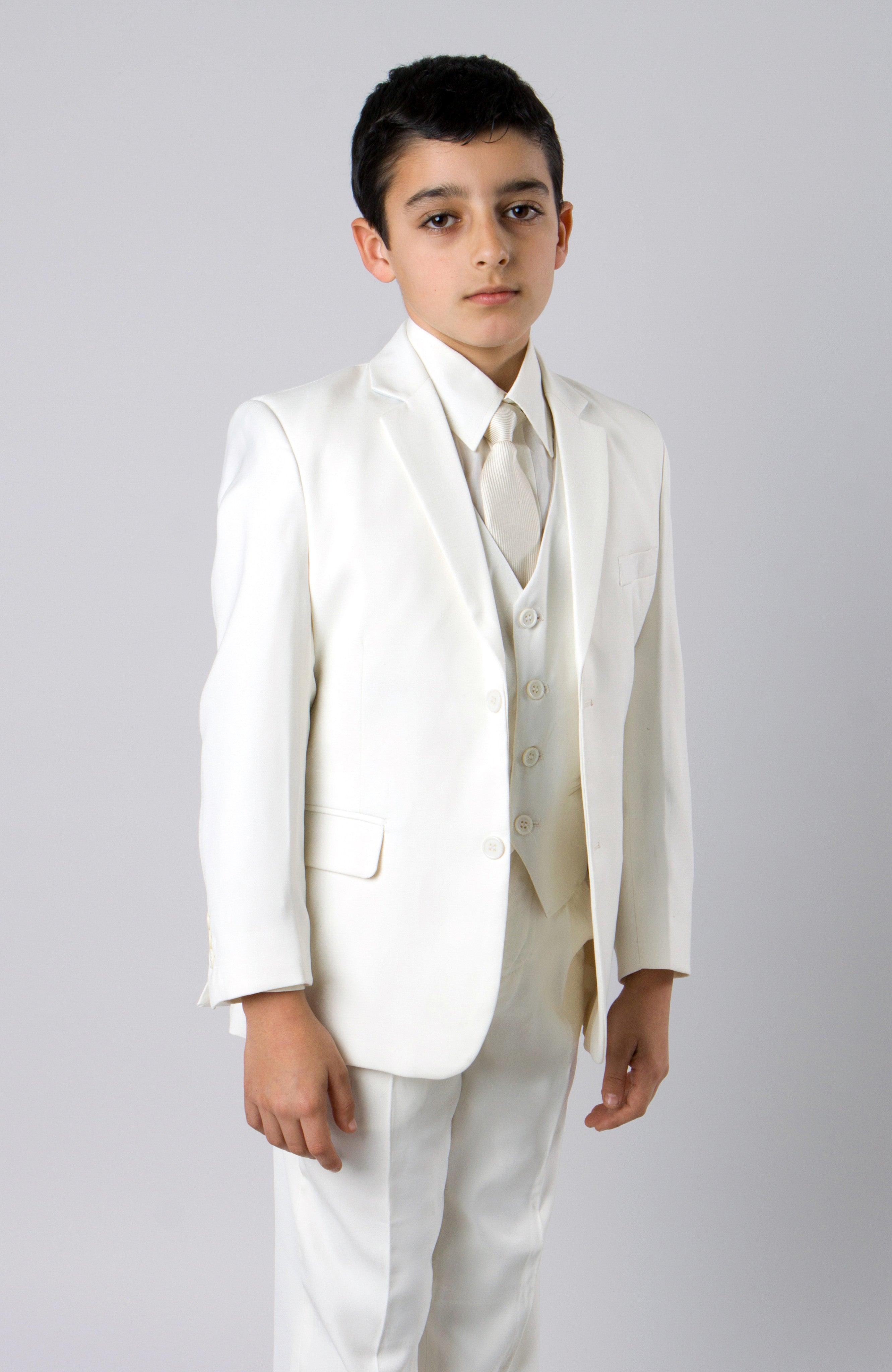 Dress up your little man quickly with this five piece off white boys suit. It comes complete with matching vest, shirt, and tie, eliminating the need to shop for the complimentary pieces. The traditional formal cut of the suit ensures that your child looks his best for any occasion. The pants can be hemmed to the proper length for a true formal appearance.