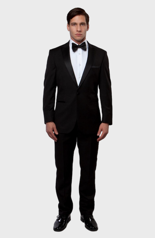 The cut of this black tuxedo is such that it can be worn to semi-formal and formal events. The jacket is single breasted and has a single button closure. It features a traditional lapel width with a high-cut peak and is satin faced. The jacket length comes to just below the hips and has a lightly tailored cut. Pleated front pants have a satin waistband and a straight cut leg.