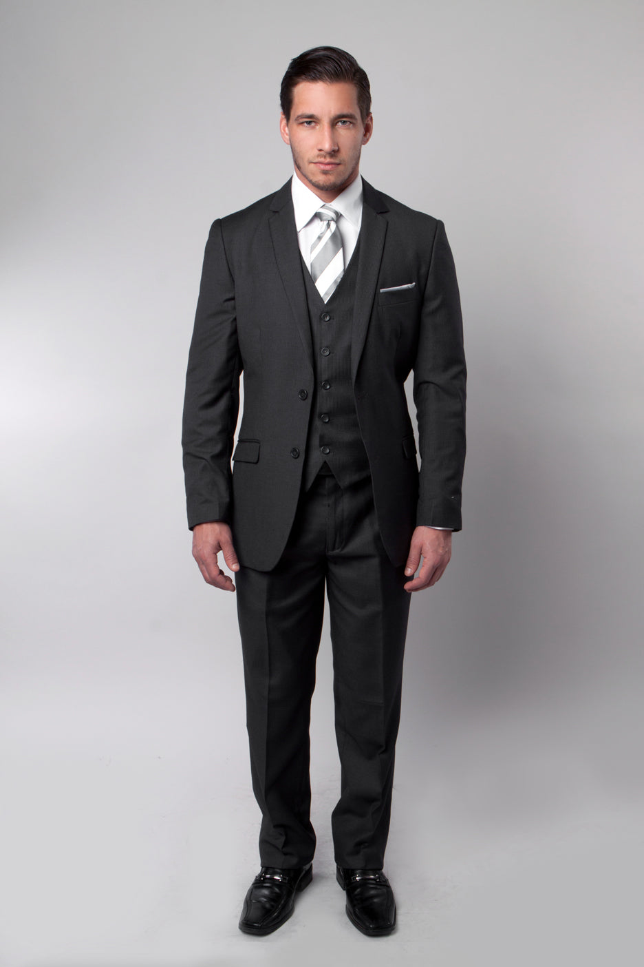 A high-class, high-fashion formal suit for men! The smart pinstripe fabric adds a modern touch to the traditional design of a men's 3 piece black suit, while the slim-fitting style gives a trim silhouette to make you look lean. Wear to weddings, family functions, and any event that has a distinguished, formal dress code to demonstrate your exceptional sense of style.