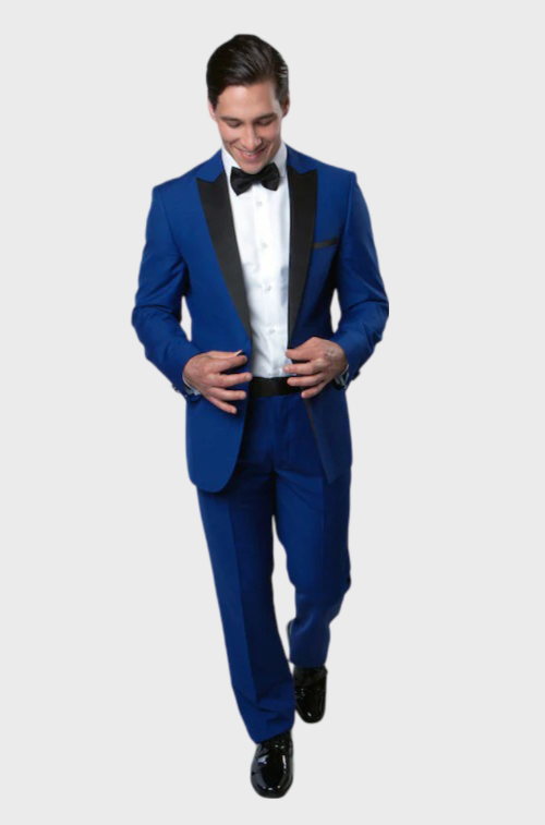 The cut of this blue tuxedo is such that it can be worn to semi-formal and formal events. The jacket is single breasted and has a single button closure. It features a traditional lapel width with a high-cut peak and is satin faced. The jacket length comes to just below the hips and has a lightly tailored cut. Pleated front pants have a satin waistband and a straight cut leg.