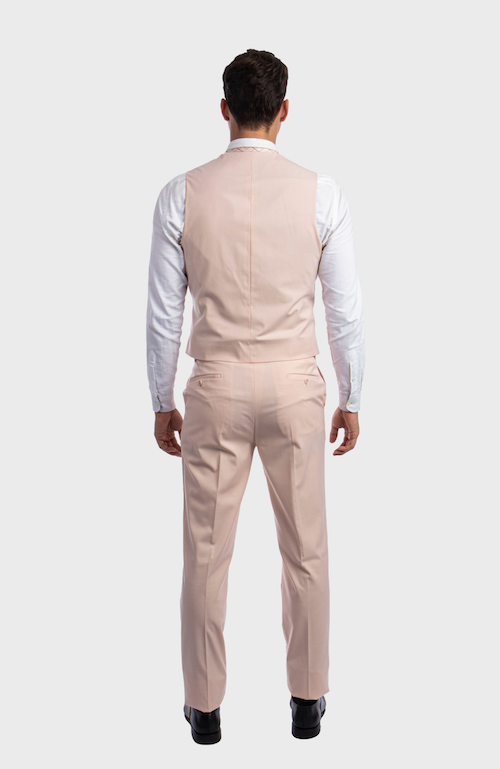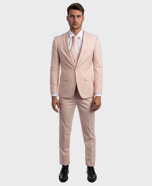 This is a truly stunning men's blush pink 3 piece suit. The Jacket is a 1 button peak lapel, this men's 3 piece suit can be worn to a prom, as a homecoming suit, or any formal event. Remove the jacket to reveal the traditionally-styled round neck vest