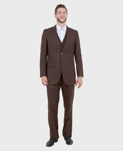 Looking sharp has never been easier than with this stylish and modern brown pinstripe 3 piece suit. The suit comes with a jacket, pants, and vest, all in a slim fit that is sure to turn heads. The notch lapel and 2 button closure give the suit a touch of class, while the brown pinstripe pattern keeps it looking modern and trendy. Whether you're headed to the office or out on the town, this suit will have you looking your best.