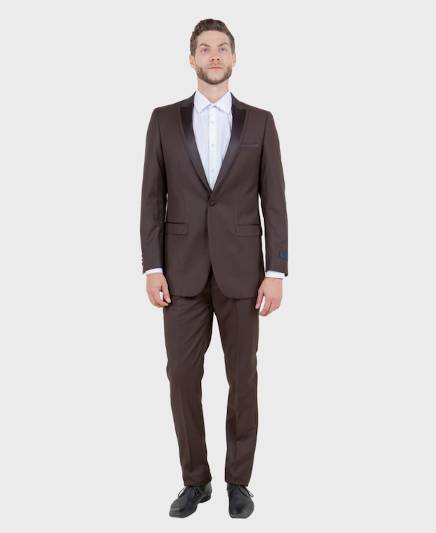 Stand out from the crowd in this single breasted brown tuxedo with its slimming cut. The jacket features a single button closure. Its narrow lapels come to a high peak towards the shoulders. The lapels are faced in satin and trimmed in contrasting material. The pants feature a tapered cut, satin waistband that's adjustable for comfort, and are finished with a thin, satin stripe that goes down the side.