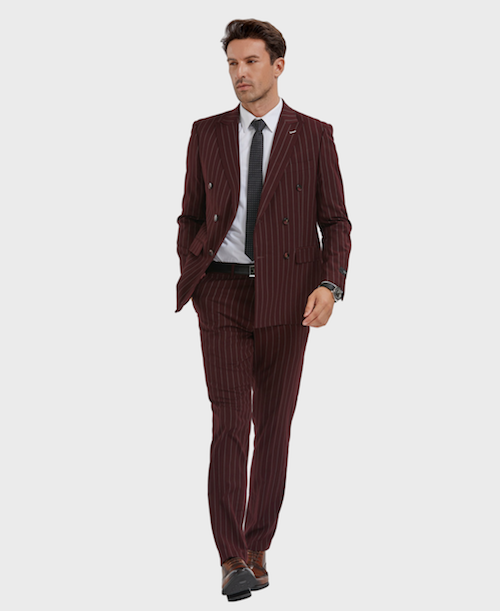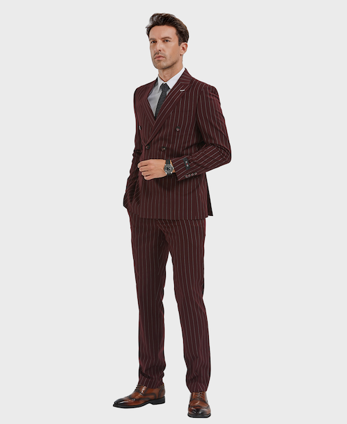 Looking sharp has never been easier than with this slim fit, double breasted Burgundy Pinstripe suit. The peak lapel and classic pinstripe design are sure to turn heads, while the rich Burgundy color will make you stand out from the crowd. This suit is tailored to perfection and will make you look and feel your best.
