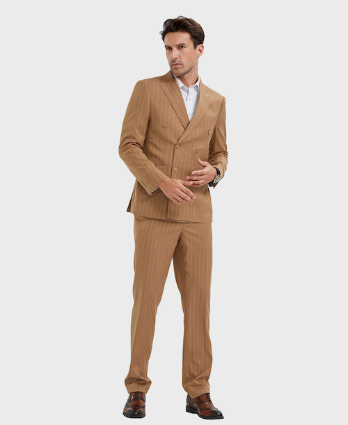 This camel pinstripe double breasted suit is the epitome of style and sophistication. Crafted from a high quality wool blend, it features a slim fit design and peak lapels for a sharp, tailored look. The perfect choice for any formal occasion, this suit will have you looking your best.