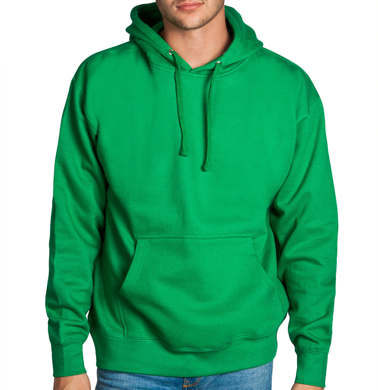 Our Green pullover fleece hooded sweatshirt in an promotional weight. Heavy cotton content works great with heat presses and any other printing method. Features include lined hood with self fabric, heavy drawstring cord, and spandex in the ribbing at the cuff and sleeve. Double needle stitching all over. Generous pouch pocket.