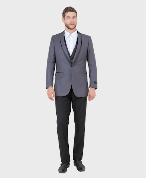 This grey three piece suit is perfect for any formal occasion. The single breasted jacket features a single button closure, cutaway front, and a shawl lapel with high peak. The lapel features contrasting fabrics. The jacket front is cut low to let the vest show through. Vest features a high button front and contrasting shawl lapel. Pants have a satin waistband with no belt loops and have a tapered cut.