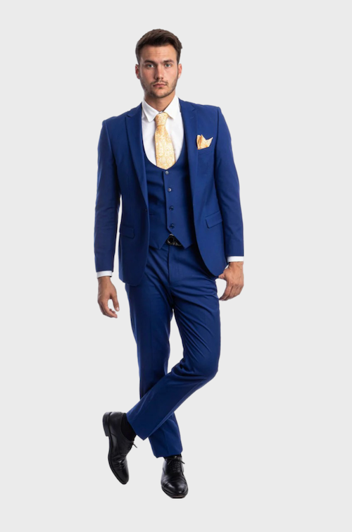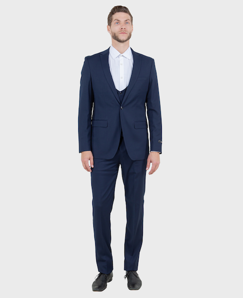 This is a truly stunning men's navy blue 3 piece suit. The Jacket is a 1 button peak lapel, this men's 3 piece suit can be worn to a prom, as a homecoming suit, or any formal event. Remove the jacket to reveal the traditionally-styled round neck vest