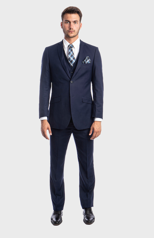 This is a truly stunning men's navy blue suit. Combining practical design with luxurious styling, this men's 3 piece suit can be worn to a prom, as a homecoming suit, or as a men's wedding suit. Remove the jacket to reveal the traditionally-styled vest and showcase your high-class approach to contemporary fashion.