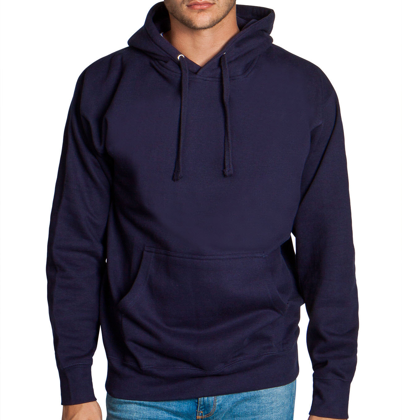 Our Navy pullover fleece hooded sweatshirt in an promotional weight. Heavy cotton content works great with heat presses and any other printing method. Features include lined hood with self fabric, heavy drawstring cord, and spandex in the ribbing at the cuff and sleeve. Double needle stitching all over. Generous pouch pocket.