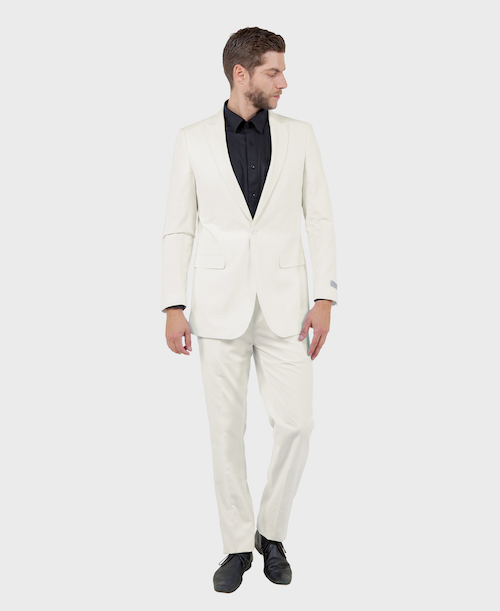 This smartly off white tailored business suit for men has a professional look combined with modern detailing. Wear as a men's church suit to a wedding or other function; the single-breasted, single-button design is comfortable enough for extended wear, from day through to night. Look smart at work or in meetings in one of the darker shades. Alternatively, the white suit for men makes for sophisticated summer attire.