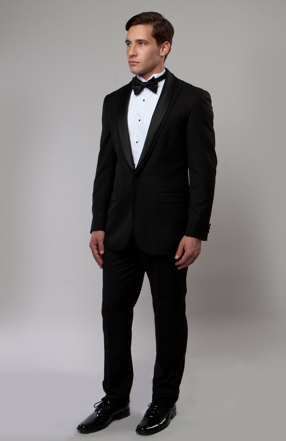 Look your very best in this slimming black tuxedo that never goes out of style. This standard length formal jacket features a shawl cut lapel with high peak. The lapels are faced with trimmed satin for contrast. The single breasted cut has a single button closure. It comes with flat front pants that has a satin waistband and belt loops. Satin piping goes down the side seam to complete the look.