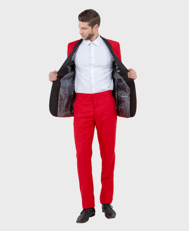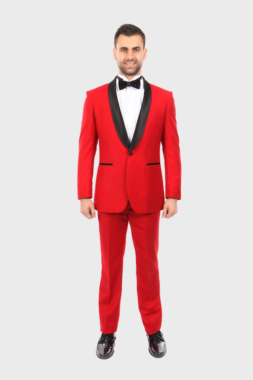 This red tuxedo is excellent to wear for any formal occasion with its narrow shawl collar and single-button closure. The collar is a true shawl style with no notch. The lapel is faced in a subtle satin material for contrast. The jacket has a low-cut front that can be worn with a vest or without. The flat front pants have a straight leg cut that won't go out of style.