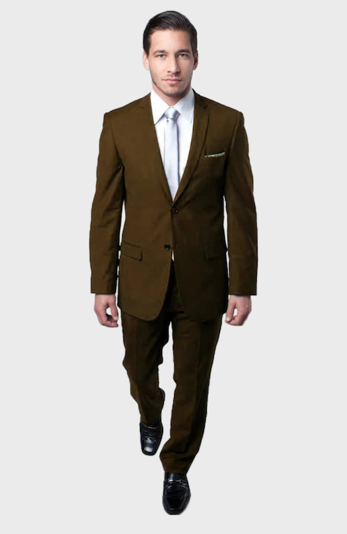 This brown 2-button slim cut suit will keep you at the forefront of fashion with its clean, straight lines. The notch lapels give the suit a contemporary appearance so you can wear it for years to come and stay stylish. The two button front is cut so you can show off your favorite tie while looking elegant. The flat front pants helps make you look fit and trim. Pants can be trimmed to length.