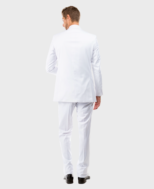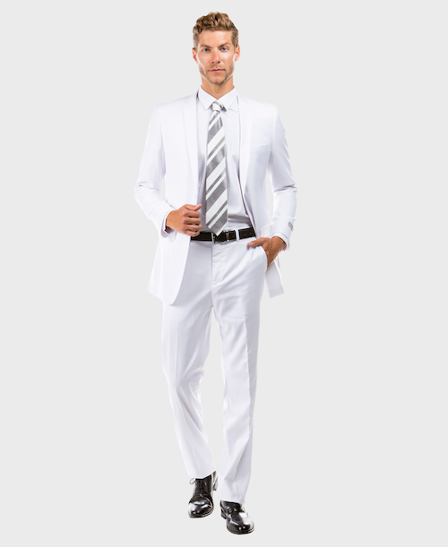This white 2-button slim cut suit will keep you at the forefront of fashion with its clean, straight lines. The notch lapels give the suit a contemporary appearance so you can wear it for years to come and stay stylish. The two button front is cut so you can show off your favorite tie while looking elegant. The flat front pants helps make you look fit and trim. Pants can be trimmed to length.