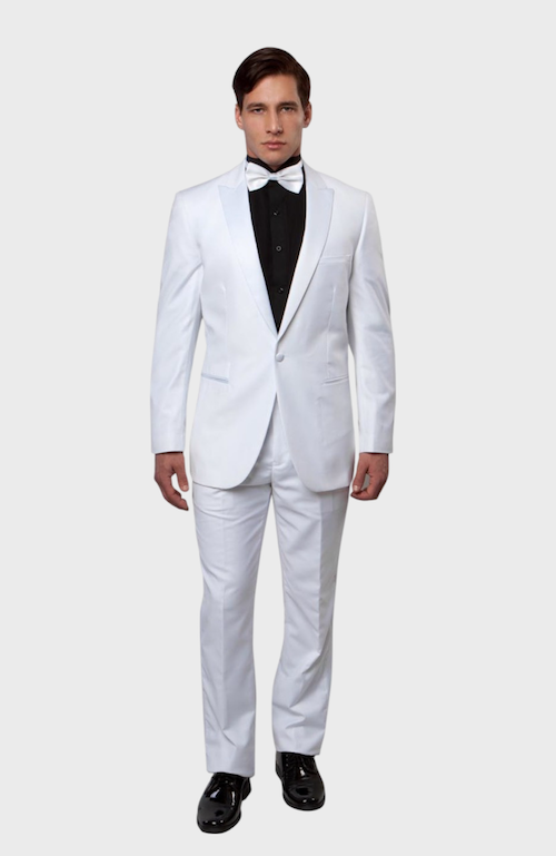 The cut of this white tuxedo is such that it can be worn to semi-formal and formal events. The jacket is single breasted and has a single button closure. It features a traditional lapel width with a high-cut peak and is satin faced. The jacket length comes to just below the hips and has a lightly tailored cut. Pleated front pants have a satin waistband and a straight cut leg.