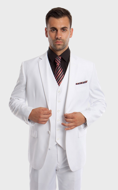 This white three-piece suit is perfect for semi-formal occasions. The two-button single-breasted jacket features a slim notched lapel, welt pocket on chest and flap pockets at the waistline, and four interior pockets. The lining is pic-stitched to prevent the lining from showing. The single-breasted vest has a high-cut neckline. Pants are flat-fronts with angled front pockets and two buttoned back pockets. Pants are lined to the knee.